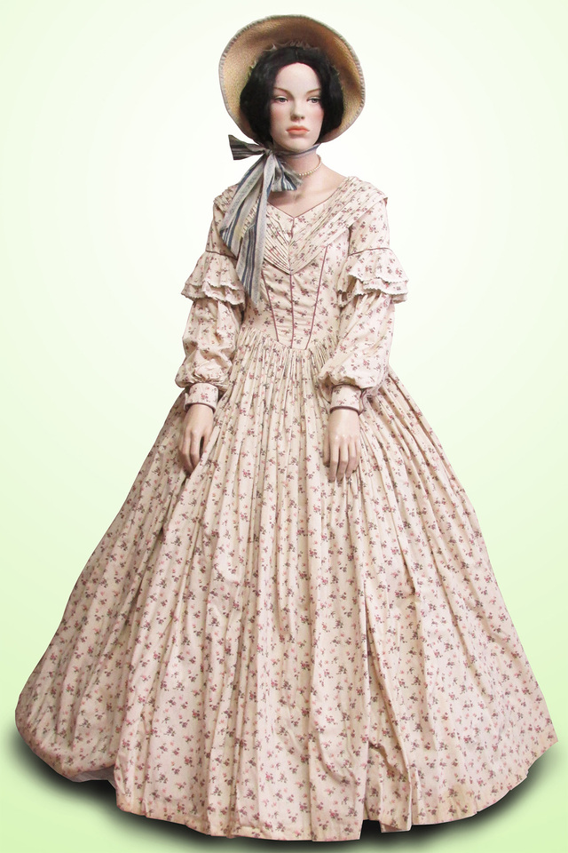 Dress with Hoop Cream with Small Flower Print 1840s Staw bonnet 1840s