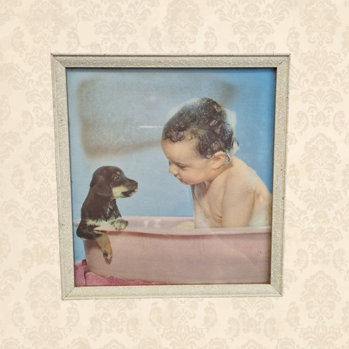 Baby and Puppy In Tub Photograph Framed (H: 25cm x W: 23cm)