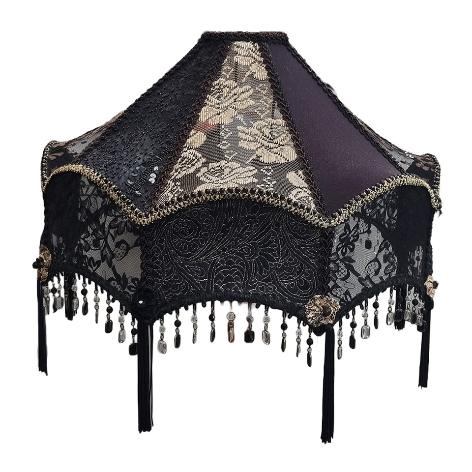 Standing / Table Lamp Shade #41 - Gothic Victorian Style, Black & Gold w/ Tassel (H: 37cm x Top Dia: 11cm x Bottom Dia: 52cm)