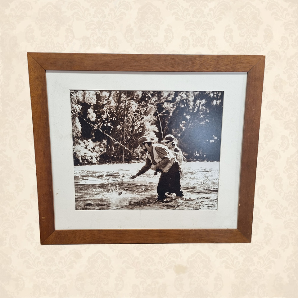 Framed Black & White Trout Fisherman in River (H: 50cm x W: 58cm)